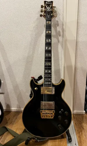 This Ibanez guitar belonged to my wife since she was in high school, and I believe it was probably made around 1975. To think she used to commute to school by train carrying this guitar and her effects pedals—my, she was quite the tough cookie. By the way, her son uses it now, and this photo was taken at his place and sent to me.